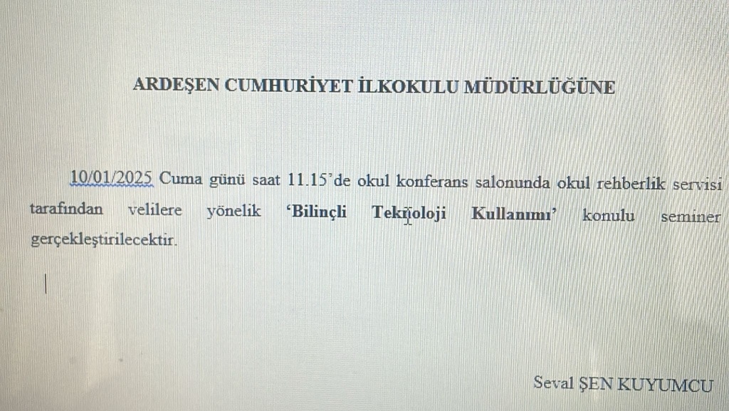 OKULUMUZ REHBER ÖĞRETMENİ SEVAL ŞEN KUYUMCU TARAFINDAN 10/01/2025 TARİHİNDE BİLİNÇLİ TEKNOLOJİ KULLANIMI VELİ SEMİNERİ DÜZENLENECEKTİR. TÜM VELİLERİMİZ DAVETLİDİR. ŞİMDİDEN KATILIM SAĞLAYACAK OLANLARA TEŞEKKÜR EDERİZ. FAYDALI OLMASINI TEMENNİ EDERİZ.